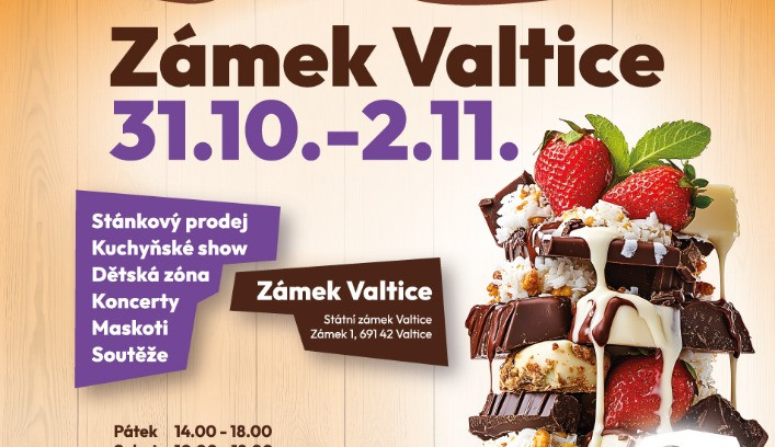 Čokoládový Festival se po dlouhé době vrací na jedno z nejkrásnějších míst jižní Moravy – zámek Valtice. Od pátku 31. října do neděle 2. listopadu 2025 se zámek promění v království čokolády, sladkostí a halloweenské atmosféry. Festival pořádaný agenturou ChrisEvents nabídne tři dny plné chutí, vůní, hudby a rodinné pohody. Vrcholem celé akce bude exkluzivní akustický koncert Pavla Callty, který se uskuteční v sobotu 1. listopadu v jedinečném prostředí zámeckých prostor.