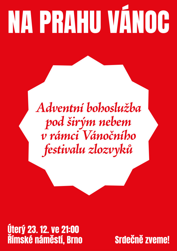 Na takzvaném Římském náměstí, kde se koná Festival zlozvyků ve spolupráci s umělkyní Kateřinou Šedou, bude 23. prosince netradiční program. V rámci festivalu, který se těší velkému návštěvnickému zájmu, se v 21.00 uskuteční přímo na veřejném prostranství vánoční bohoslužba. Povede ji farář kostela sv. Máří Magdalény Vojtěch Loub. Chybět nebudou svíčky a hudební doprovod, což zaručuje působivý zážitek.