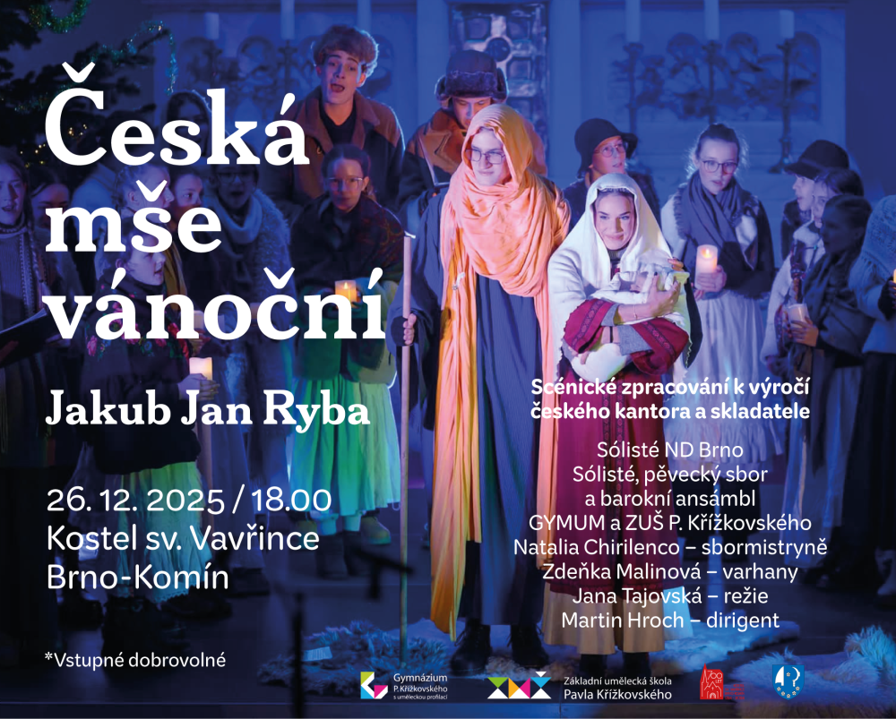 Žáci a pedagogové Gymnázia P. Křížkovského s uměleckou profilací a ZUŠ P. Křížkovského (Brno) připravili v letošním roce scénické zpracování České mše vánoční Jakuba Jana Ryby v režii Jany Tajovské Krajčovičové