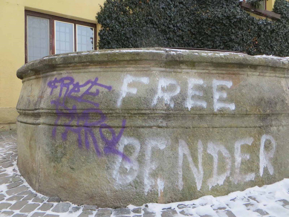 Neznámý vandal postříkal kašnu smrti v boskovické Židovské čtvrti