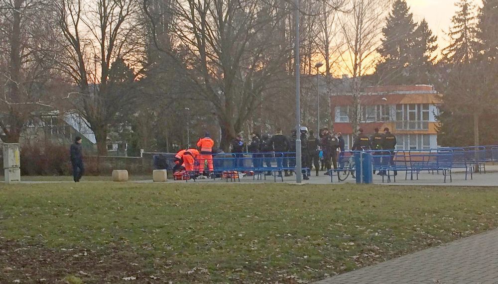 Záchranáři a policisté u oběti na náměstí Svornosti