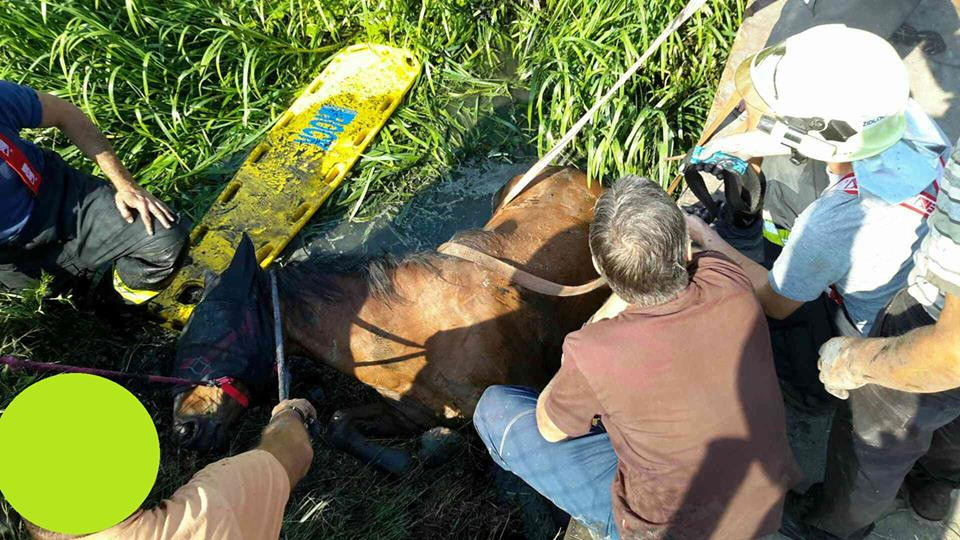 FOTO: Kůň spadl z mostu, hasiči ho zachránili z bahna