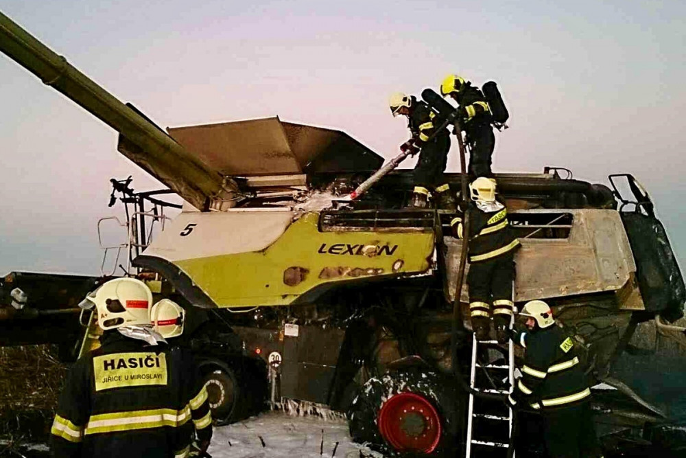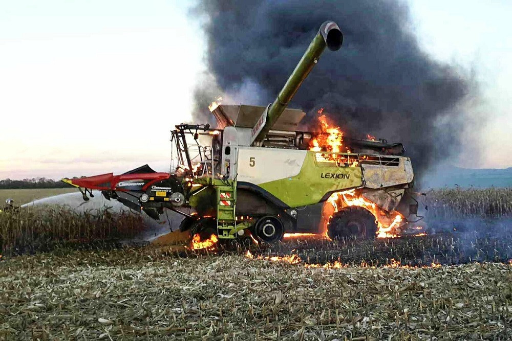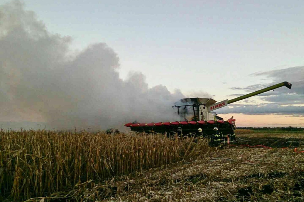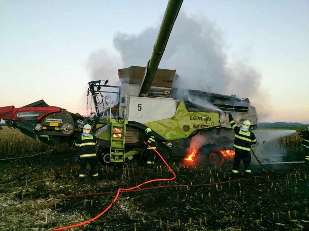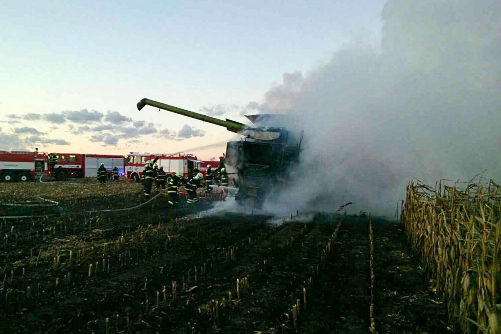 FOTO: Při sklizni kukuřice začal náhle hořet kombajn