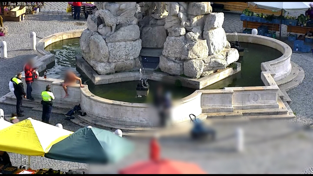 VIDEO: Opilý muž se koupal nahatý v kašně na Zelňáku. Pryč ho odvedl kamarád ze záchytky