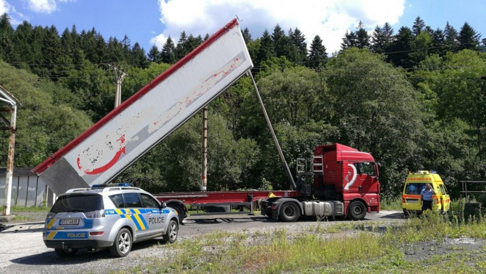 Řidič zapomněl sklopit korbu náklaďáku, strhl elektrické vedení, sloup i komín
