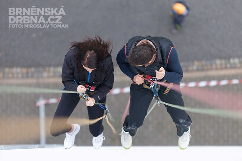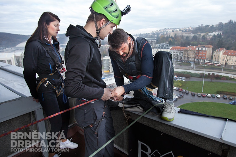 Když už ale visíte na stěně 40m domu, je čas na úsměv, foto: Brněnská Drbna