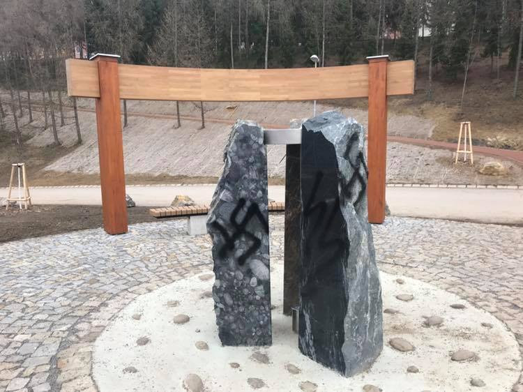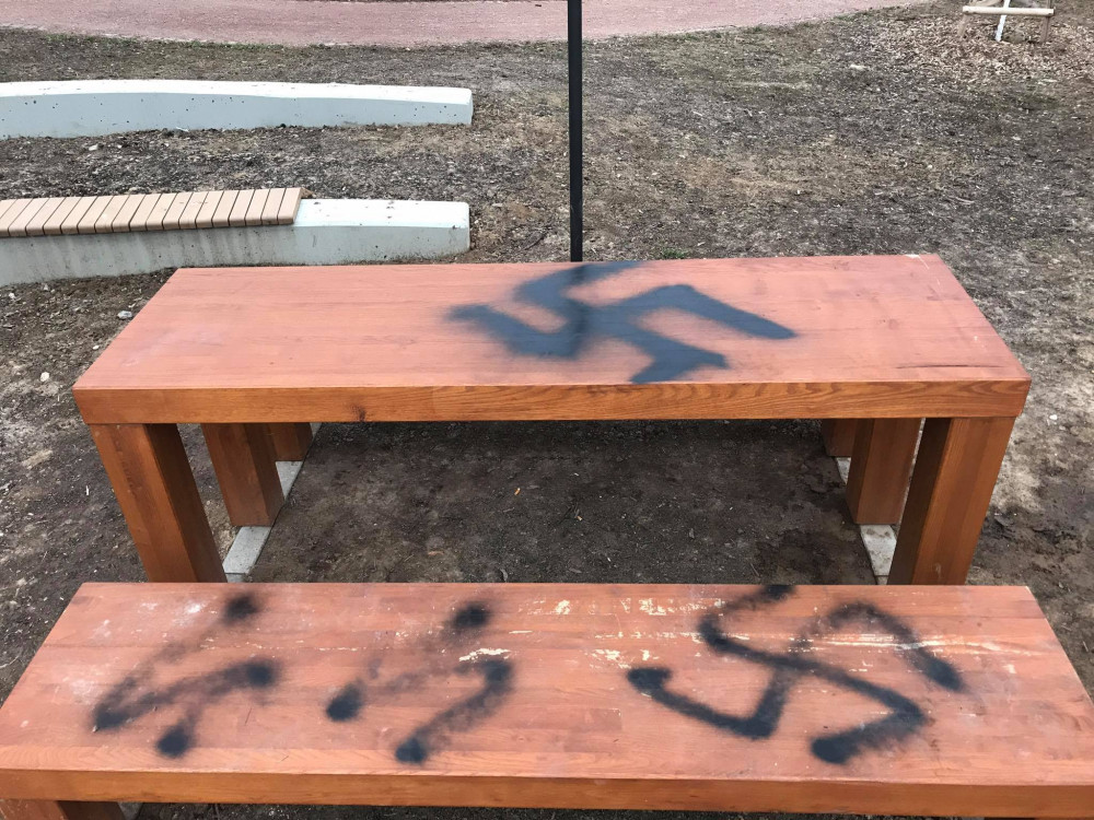FOTO: V Líšni řádil vandal. Lavičky a fontánu pomaloval nacistickou symbolikou