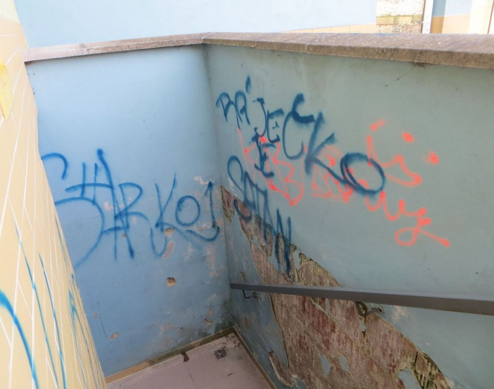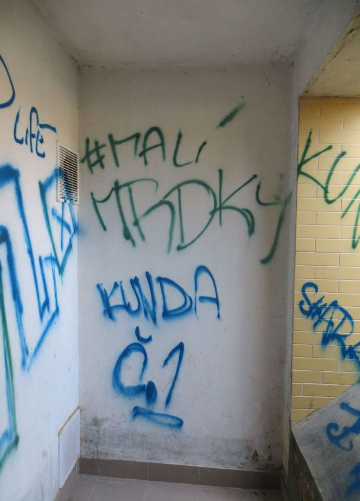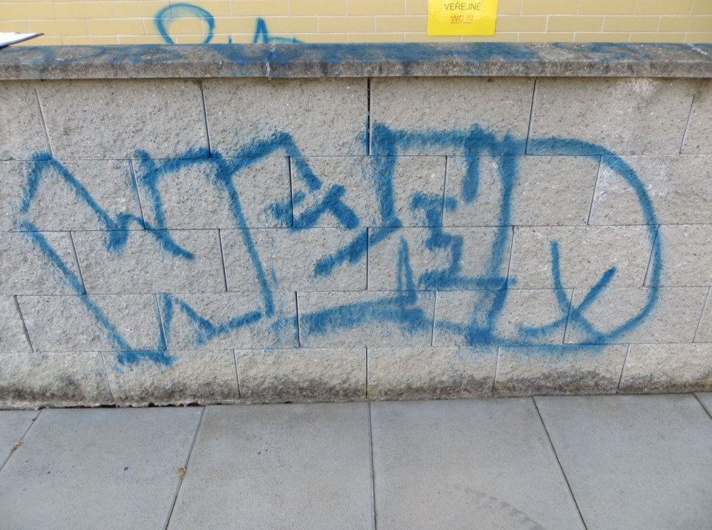 FOTO: Sociální sítě mu nestačily. Vandal s modrým sprejem veřejně sdílel životní filozofii