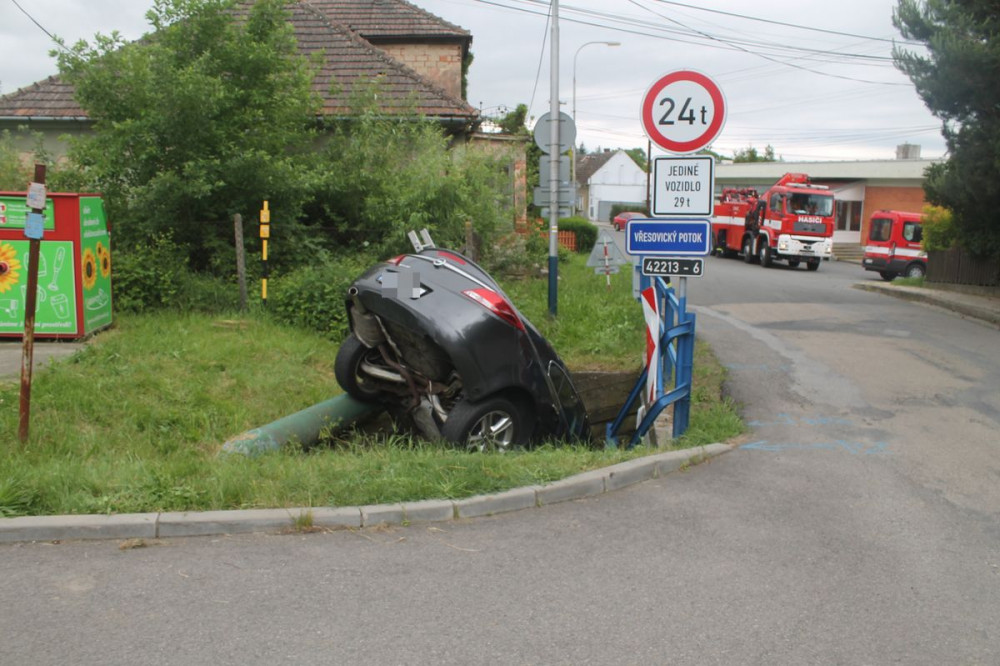 FOTO: Řidička při parkování zapomněla na ruční brzdu. Auto se rozjelo a zahučelo do potoka