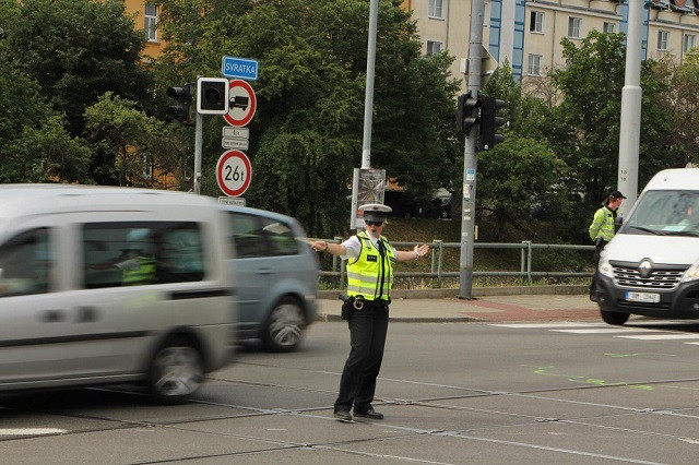 Opilý muž se rozhodl řídit dopravu na rušné křižovatce u Brna, policisté ho museli odtáhnout násilím