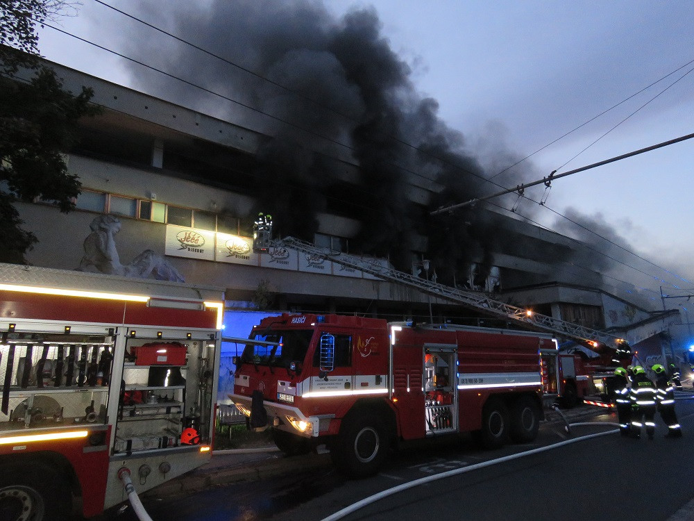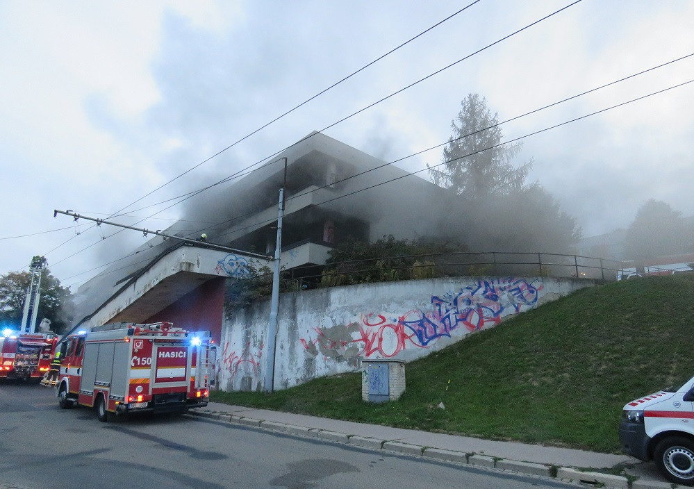 FOTO: V Bystrci hořel bývalý obchodní dům Letná. Oheň zachvátil sklad pneumatik
