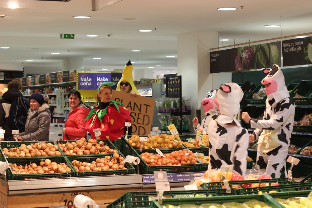 V brněnském Tescu tancovalo ovoce s krávami. Aktivisté z Animal Rebellion požadují přechod na rostlinné mléko