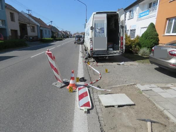 Řidič dodávky přehlédl stavbu na silnici. Narazil do dopravní značky, ta těžce zranila dva dělníky