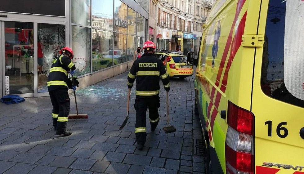 FOTO: Na Masarykově se rozjel prázdný náklaďák a přimáčkl chodkyni na výlohu. Žena skončila v nemocnici