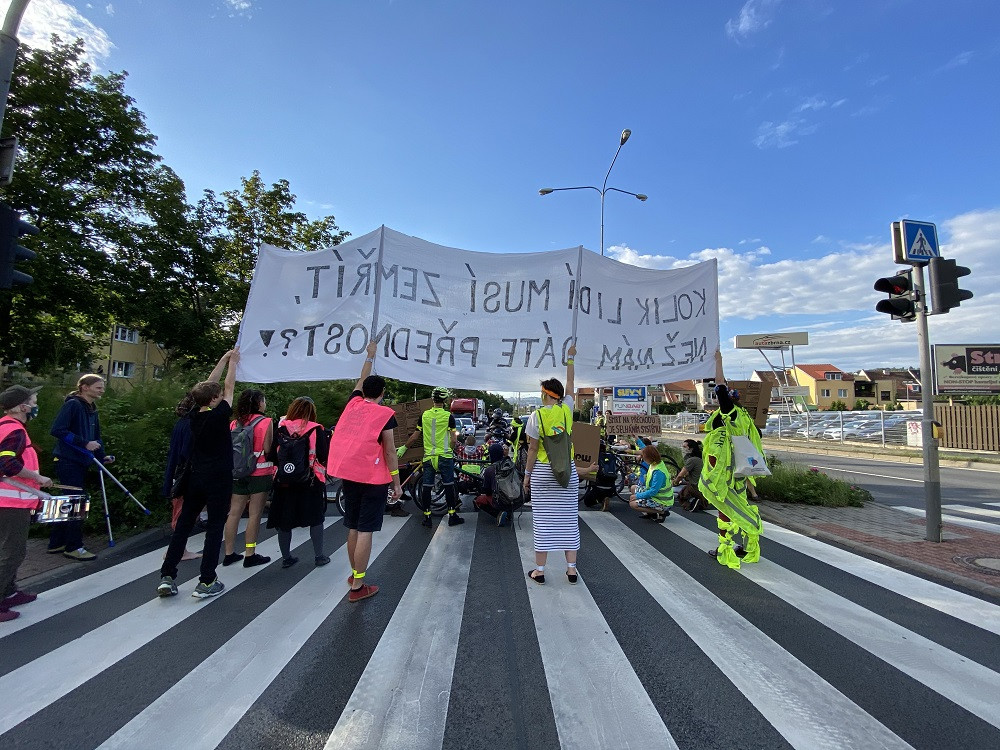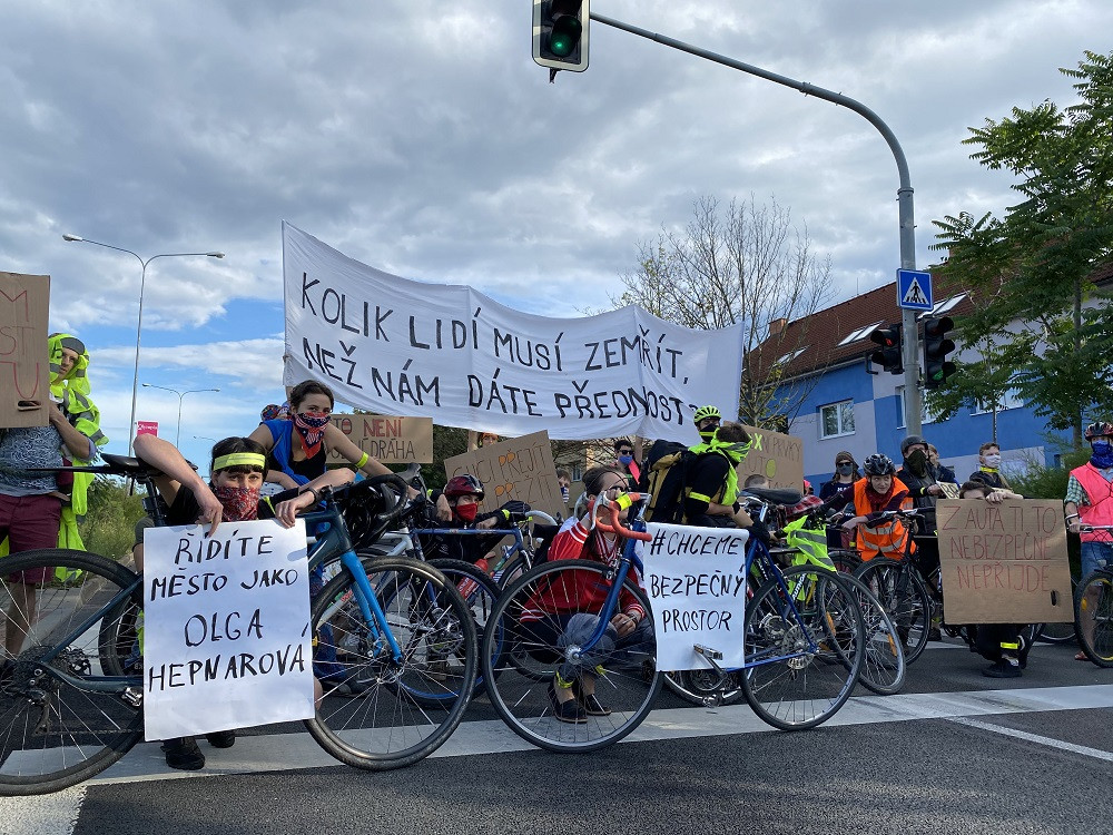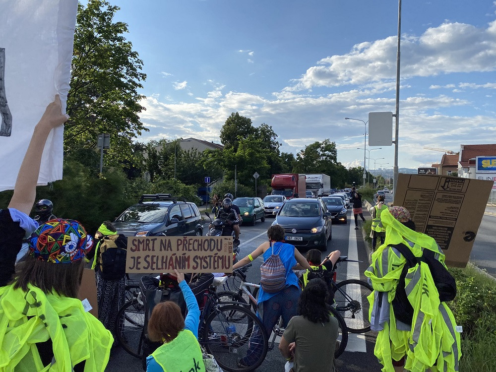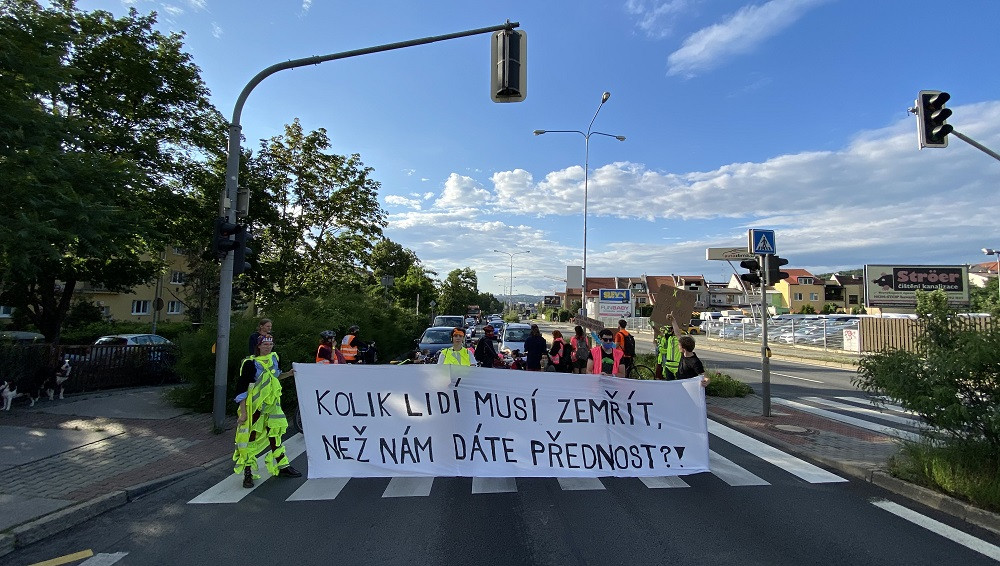 FOTO/VIDEO: Chceme bezpečný prostor. Lidé dnes v Brně blokovali dopravu v místě, kde o víkendu řidič zabil na přechodu chodce