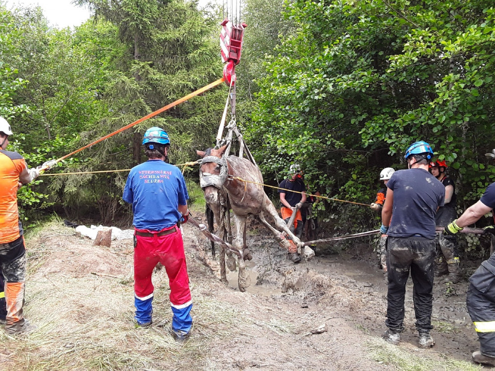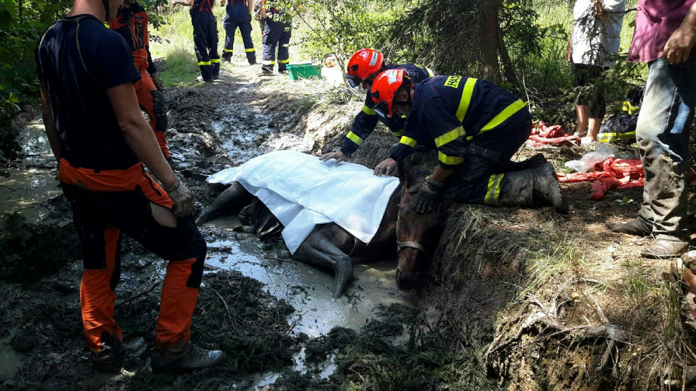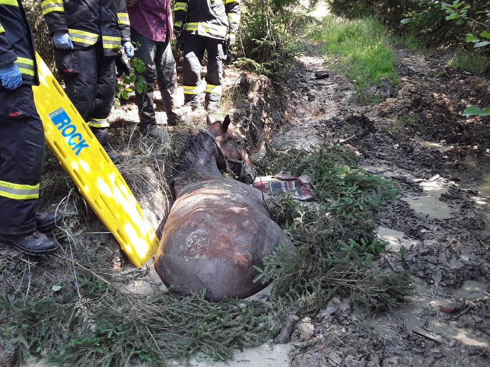 Hasiči na Brněnsku téměř pět hodin zachraňovali koně, který zapadl do blátivé bažiny na lesní cestě
