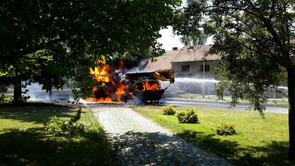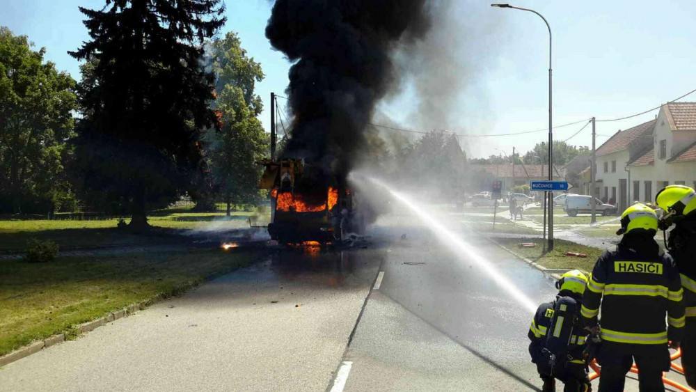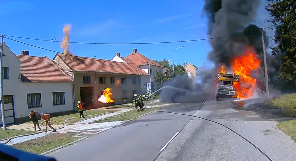 VIDEO: Při požáru jeřábu vybouchly pneumatiky, několik hasičů se zranilo