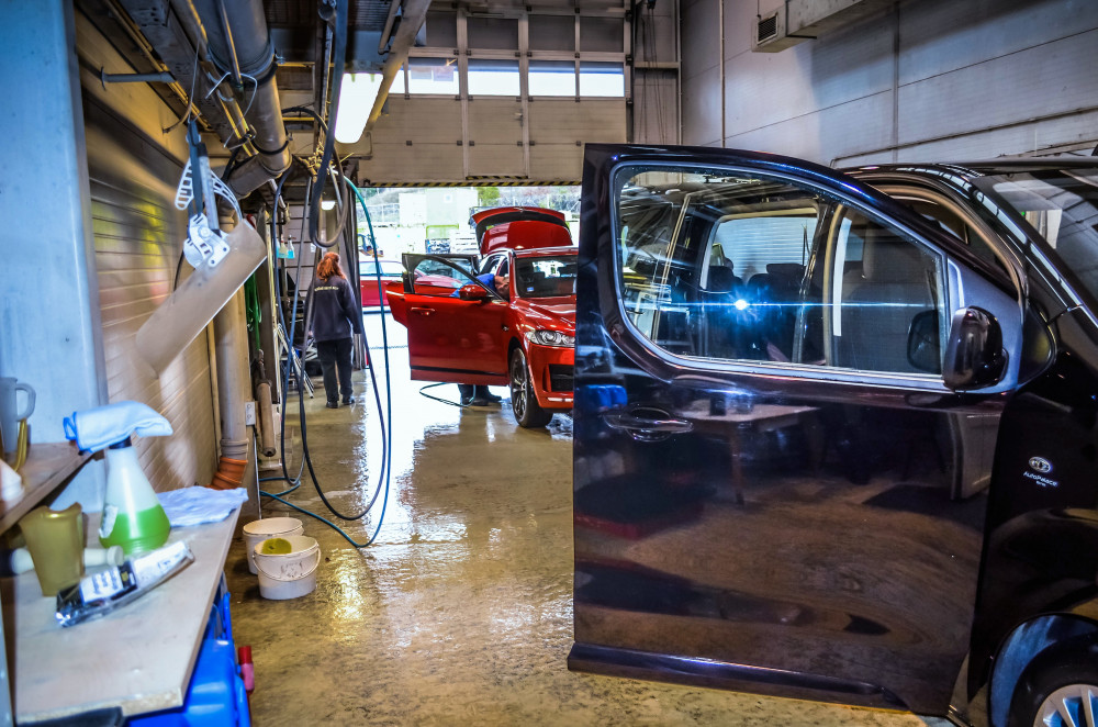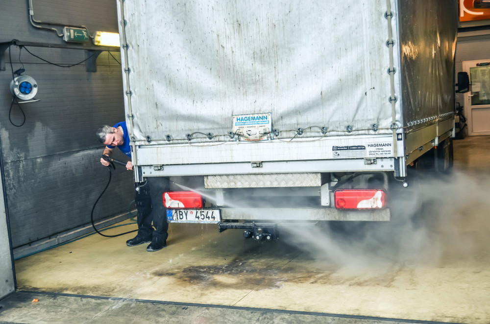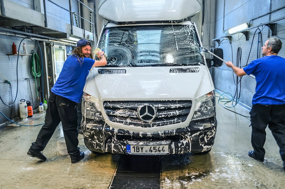 Z ruční myčky v Křižíkově ulici vycházejí nablýskaná osobní auta, ale třeba i náklaďáky či jeřáby