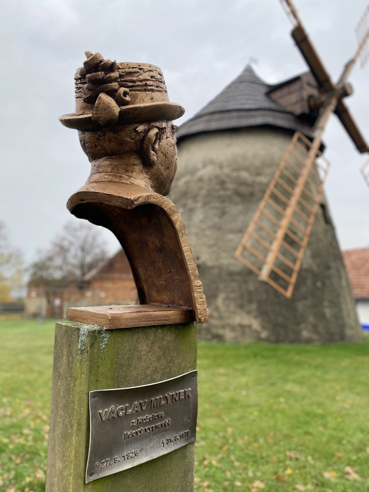 Na větrný mlýn dohlíží busta lidového vypravěče Václava Mlýnka z Kuželova