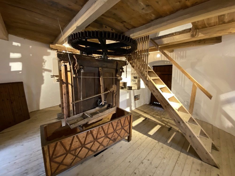 V nejvyšším patře mlýna se nachází systém mlýnského kola