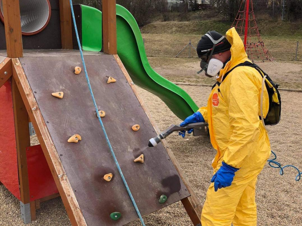 Dezinfekce dětských hřišť ve Znojmě. Zdroj: FB Jakuba Malačky