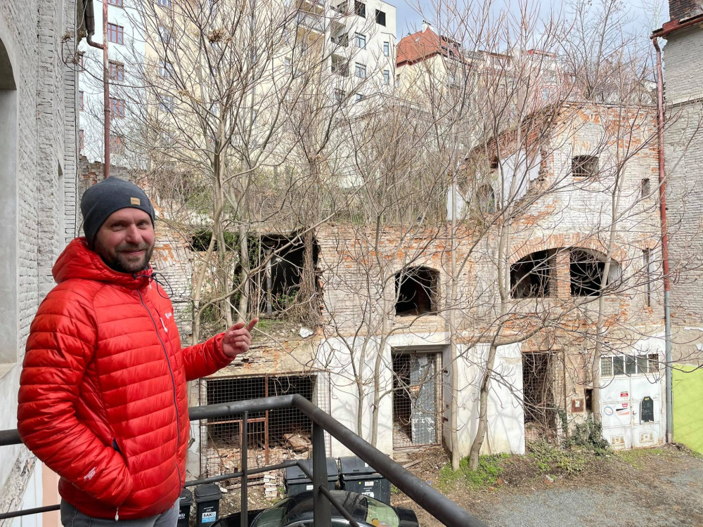 Karel Sklenář před bývalým pivovarem v Pekařské ulici