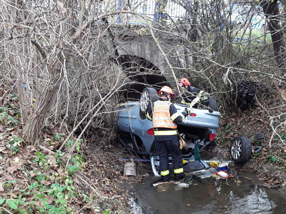 Auto při nehodě vylétlo ze silnice, skončilo na střeše v potoce