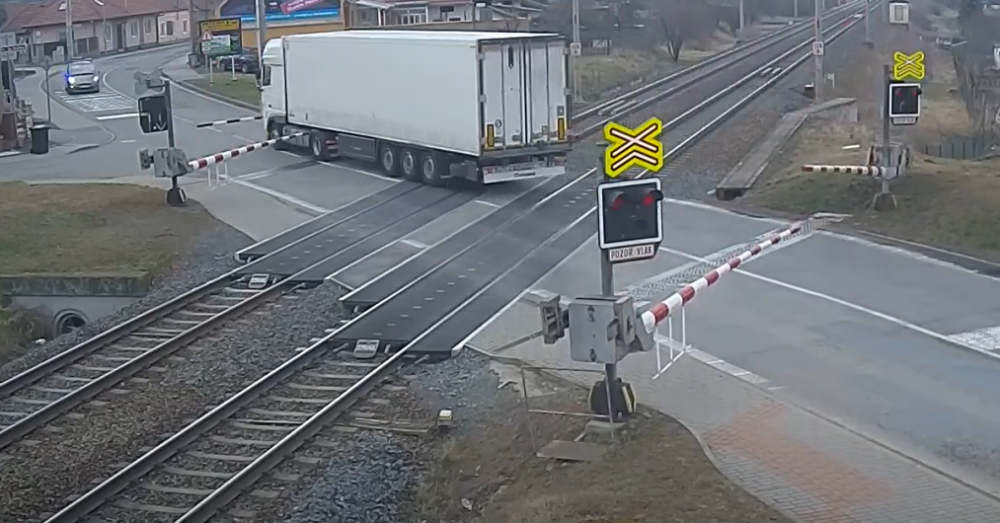 Riskantní manévr na přejezdu. Řidič polského kamionu projel na červenou a nabral závoru