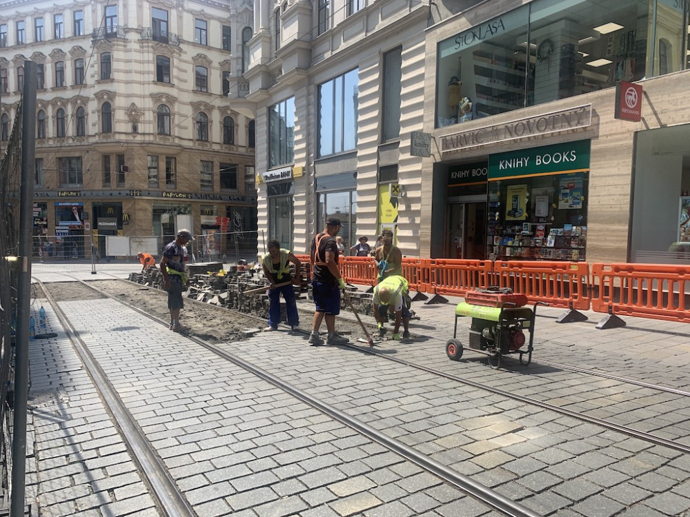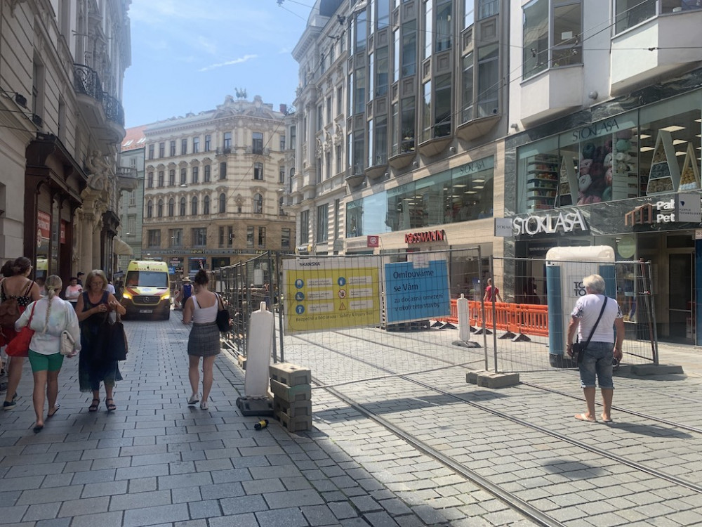 Brňany trápí rozkopaná pěší zóna. Dělníci vyměňují koleje a dlažbu, kterou zničila auta