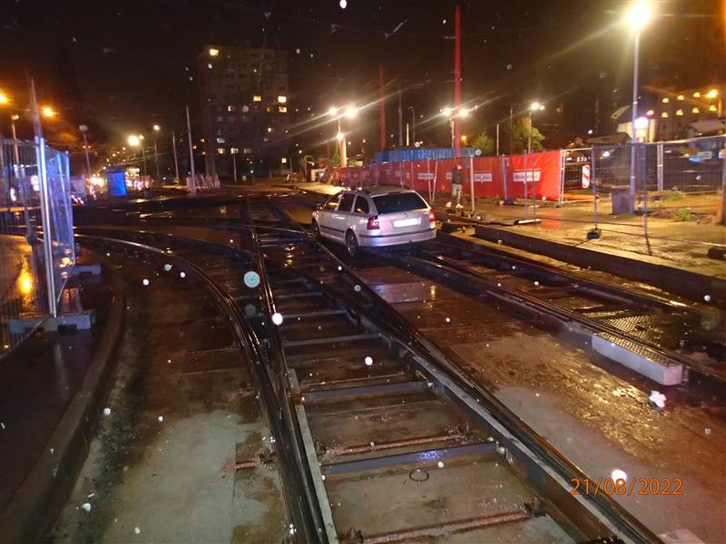 V Brně na opravovaném Mendlově náměstí uvízl v kolejišti řidič a zablokoval šaliny