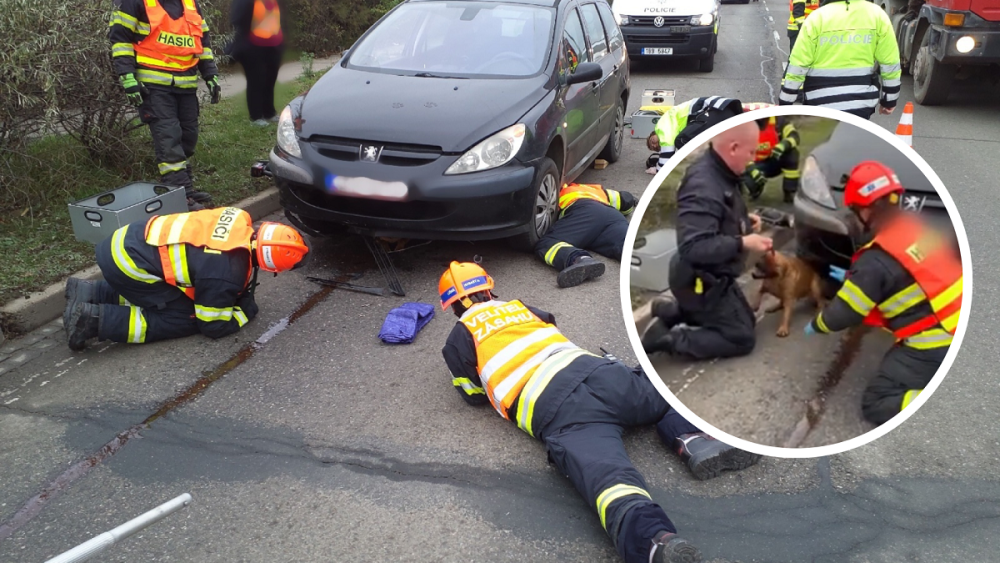 Pes z Brna zůstal zaklíněný pod autem, na pomoc přijeli hasiči