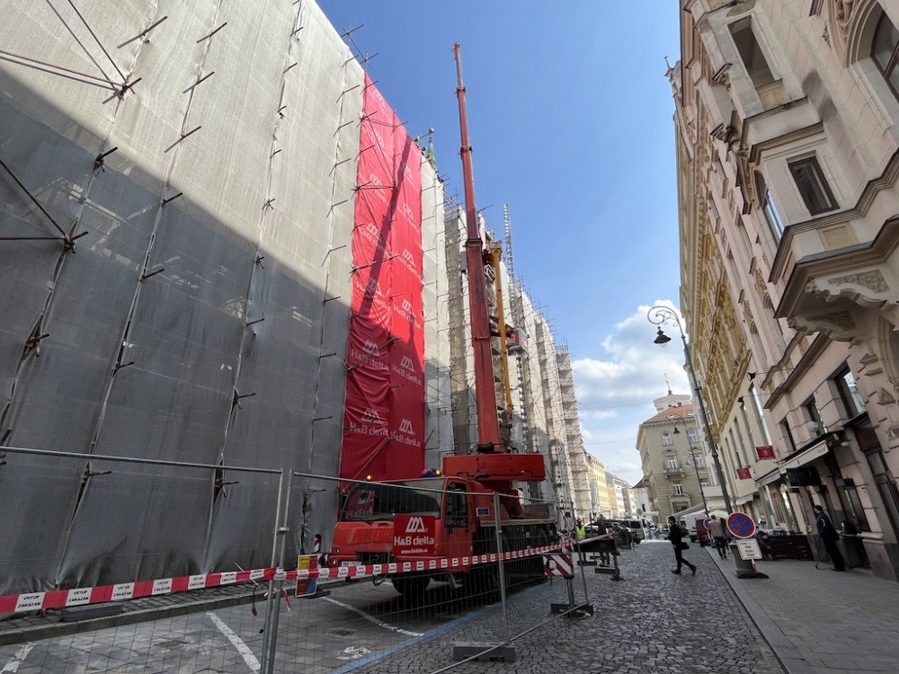 Lidé v centru Brna pozorují velký jeřáb. Stroj vrací kostelu chrliče i vimperky
