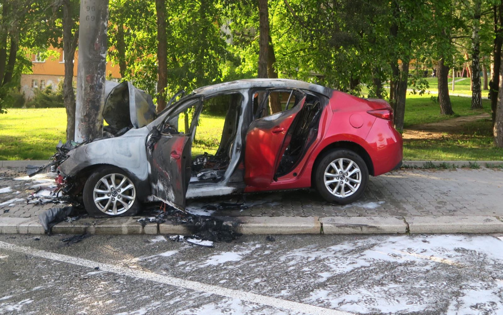 Auto v Brně narazilo do sloupu a začalo hořet. Spolujezdce oživovali kolemjdoucí strážníci
