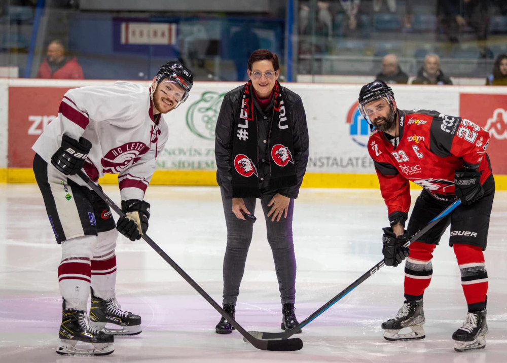 Starostka Ivana Solařová vhazuje čestné buly před finále druhé ligy