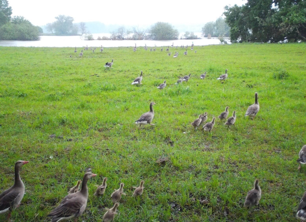 V ptačím parku se usadilo hejno sta hus s mláďaty.
