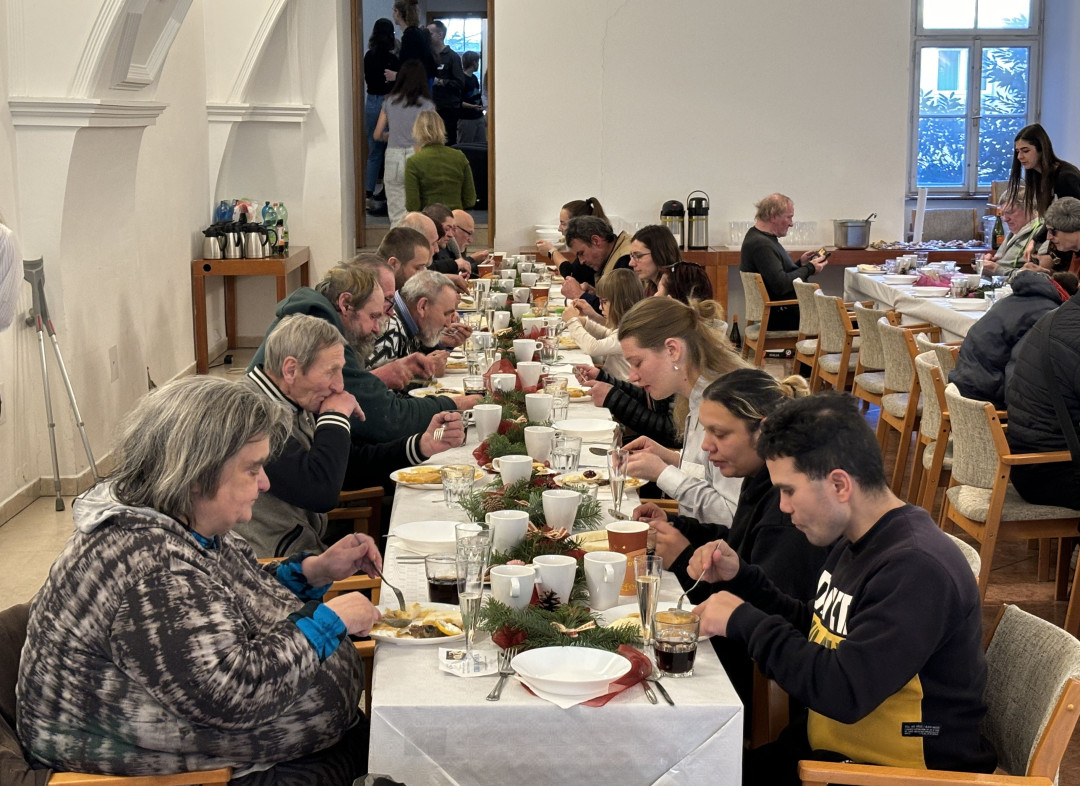 Lidé bez domova si v centru Brna pochutnali na svíčkové. Vánoční oběd pro potřebné je tradiční akcí