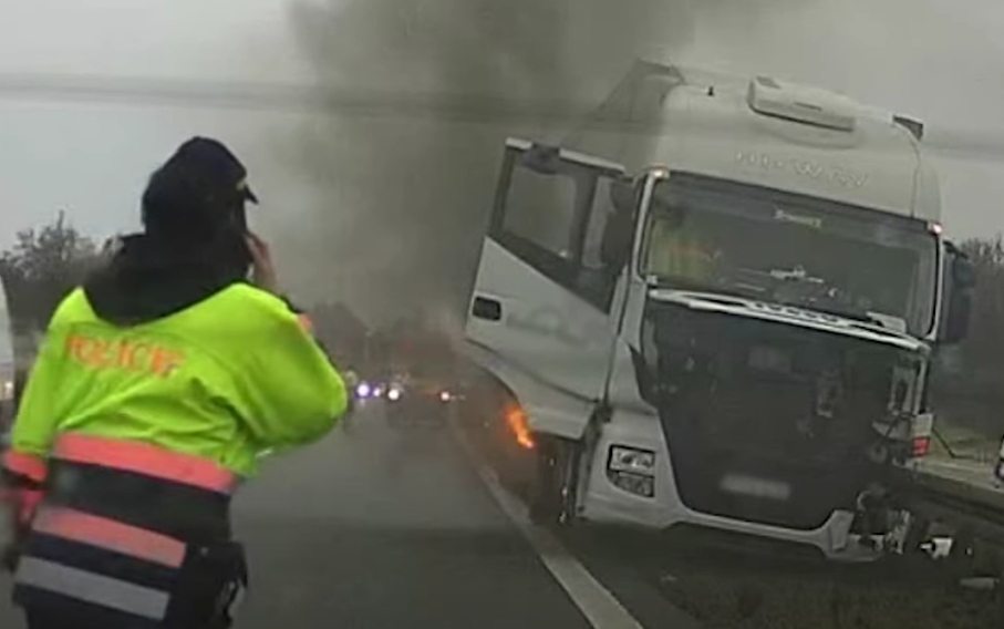 VIDEO: Řidič kamionu za volantem zkolaboval. Kolos po nárazu do svodidel začal hořet, zasáhli policisté