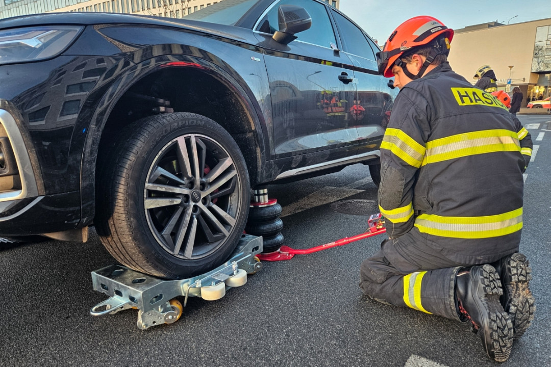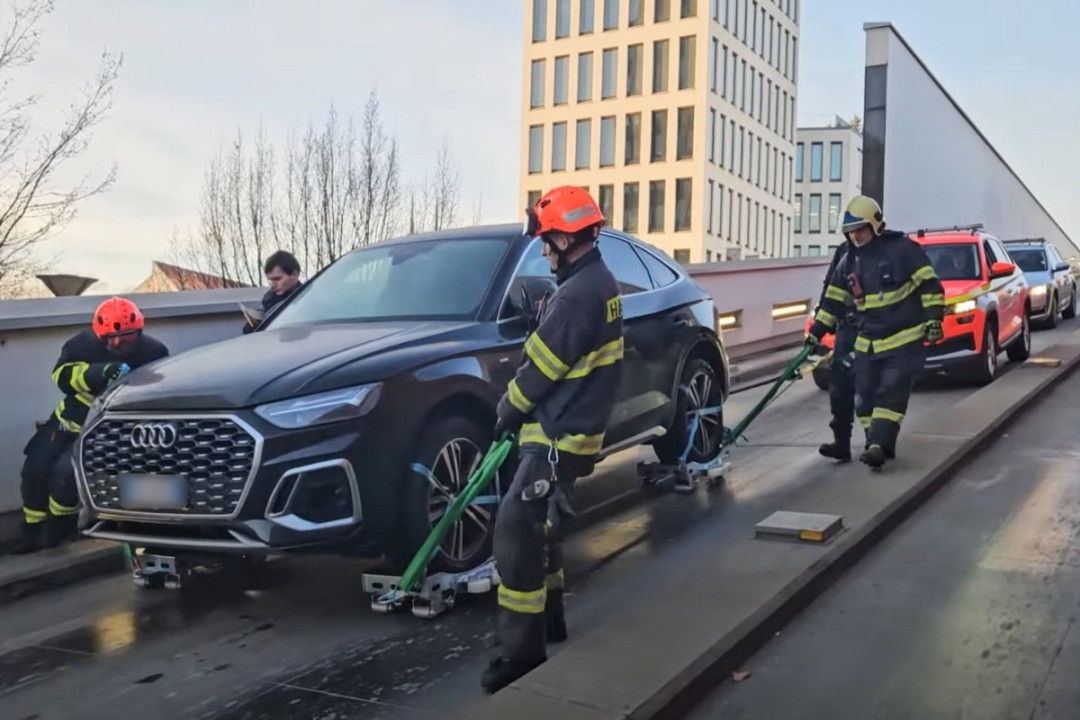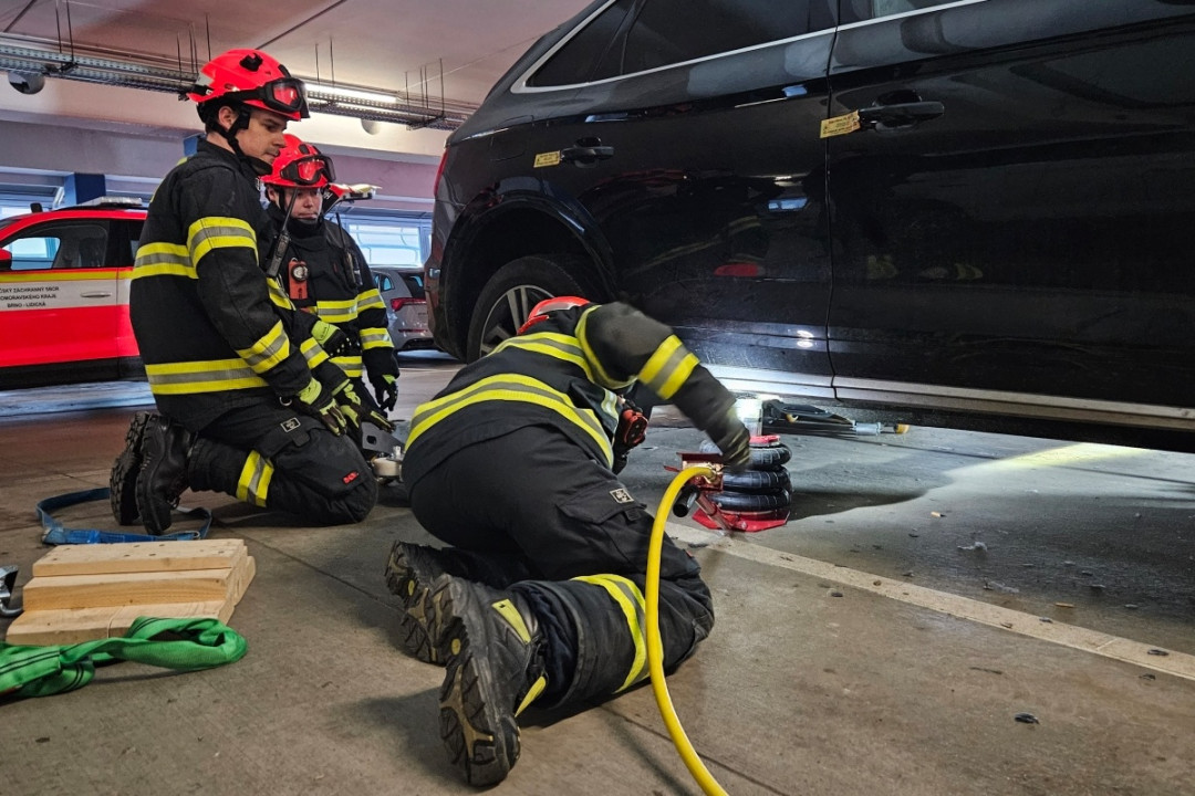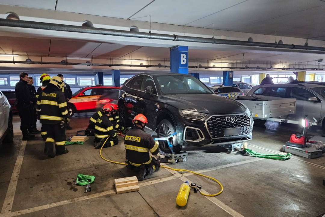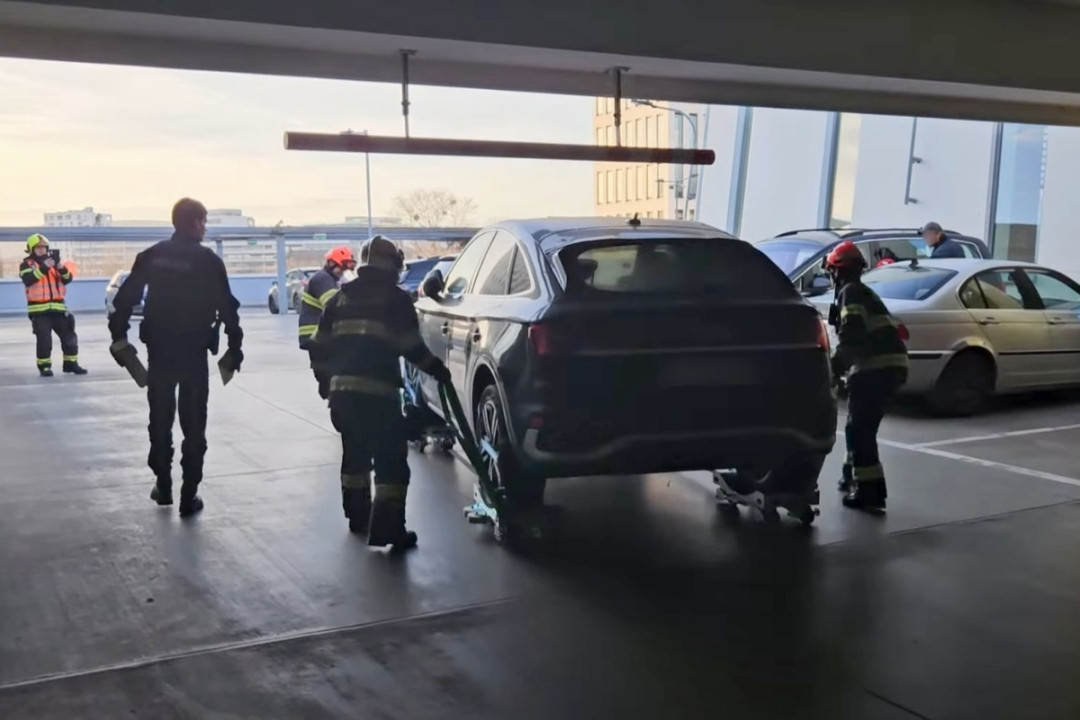 Hasiči odvezli zaparkované auto ze střešních garáží, aby ho mohla naložit odtahovka