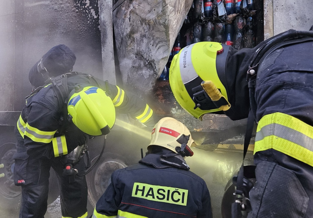 Na dálnici D1 u Brna vzplál návěs kamionu s plastovými lahvemi. Řidiči se zdrží v dlouhé koloně