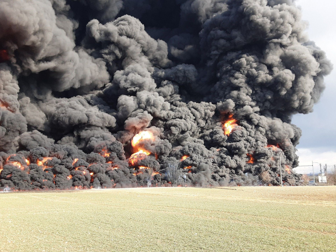 VIDEO: Obrovský požár na Přerovsku. Hoří železniční cisterny s benzolem