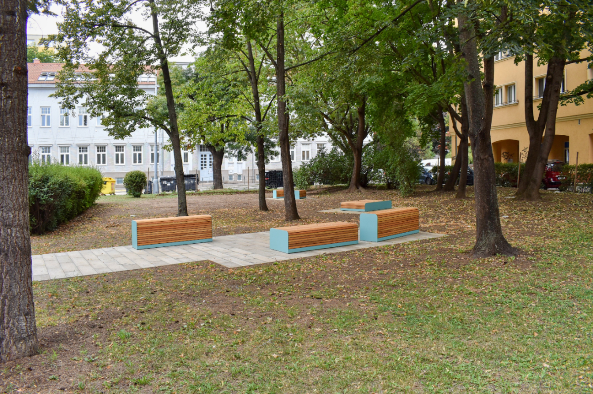 Park před gymnáziem na Vídeňské ožil. Přibyly stromy, lavičky i místo pro relax