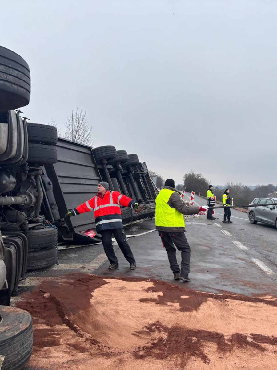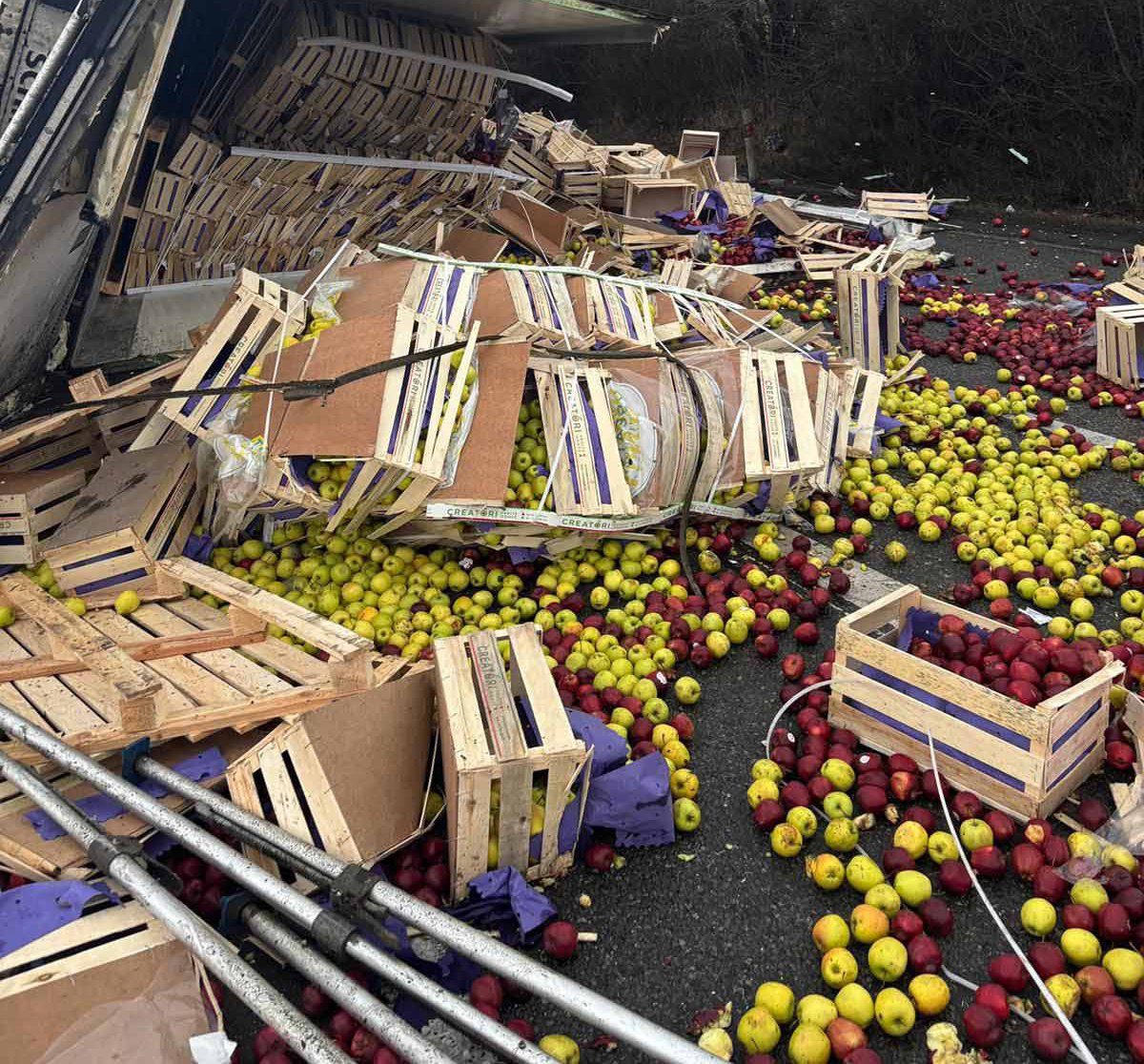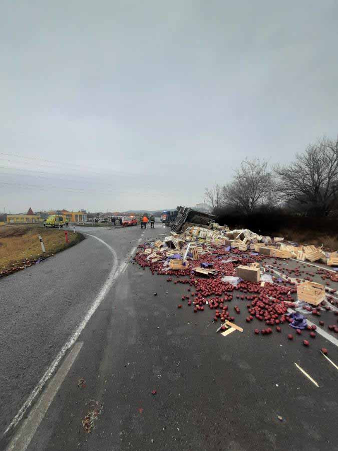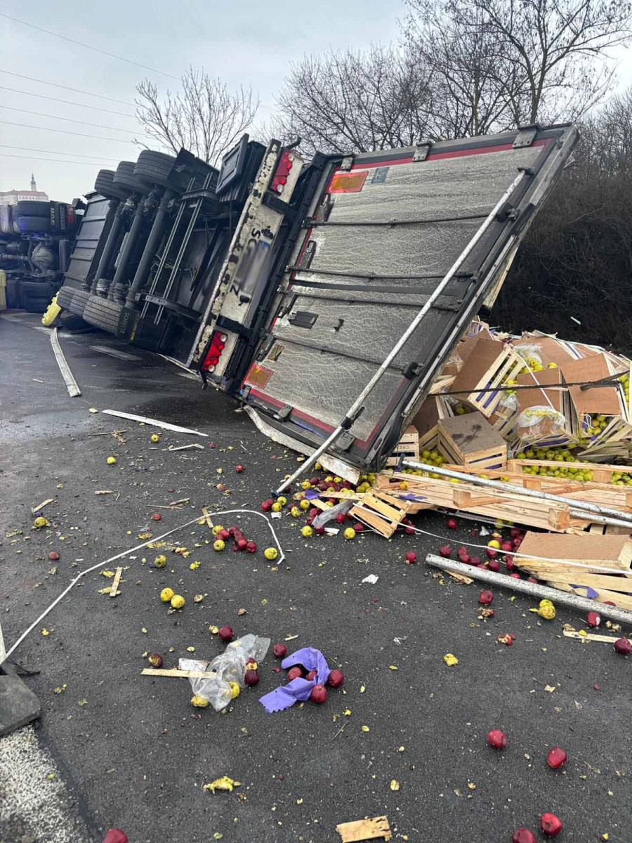 Na průtahu Mikulovem se převrátil kamion s jablky, ta se rozkutálela po celé silnici