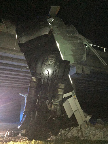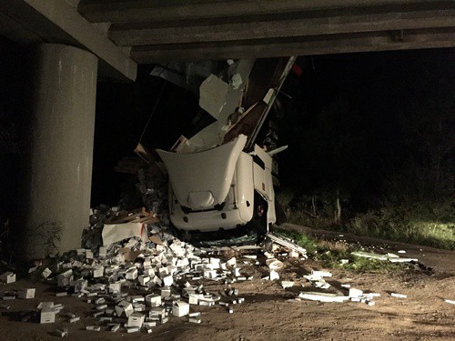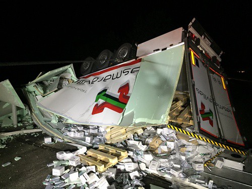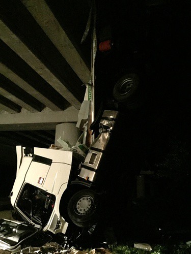 Na D2 visel převrácený kamion z mostu