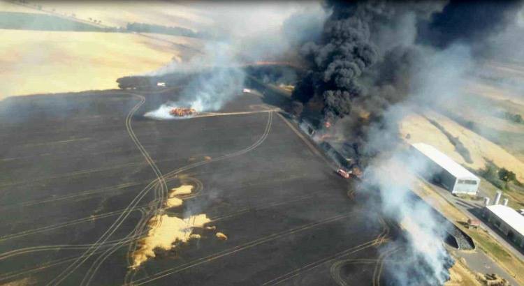 Sto dvacet hasičů bojovalo s rozsáhlým požárem pole, sila a pneumatik