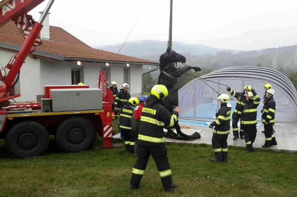 V Lelekovicích spadl kůň do šachty, zachránili ho hasiči s jeřábem