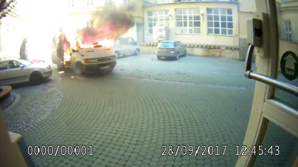 VIDEO: Brněnský strážník šel hasit auto v budově rektorátu. Těsně před ním vybouchla bomba