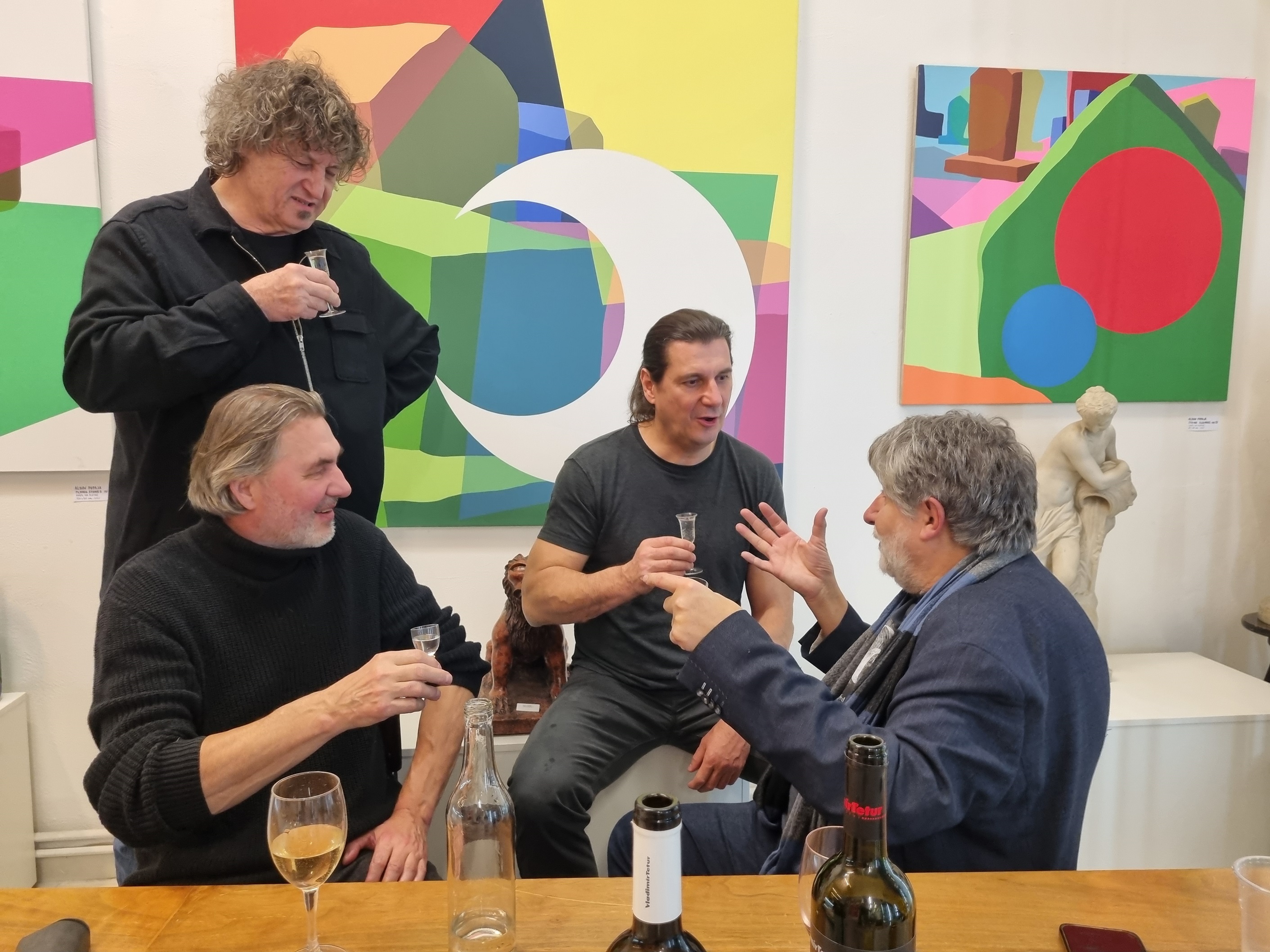 Zajímavou návštěvu galerista absolvoval i u Aldina Popaje. V jeho obrazech se harmonicky mísí barvy a geometrie. „Obraz Flying Stones No. 2 mi učaroval. Takovou kombinaci jsem dosud neviděl,“ dodává.
