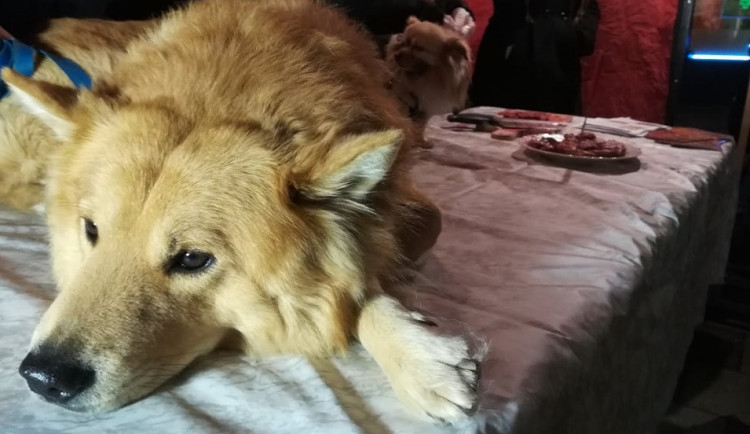Uprostřed všeho navíc spokojeně poléhavají dva pejsci. „Samozřejmě se zde žádnému pejskovi neublíží. Navíc veškeré kousky masa, které zde leží, jsou z tofu, seitanu a podobně,“ vysvětluje Mateásková.