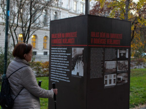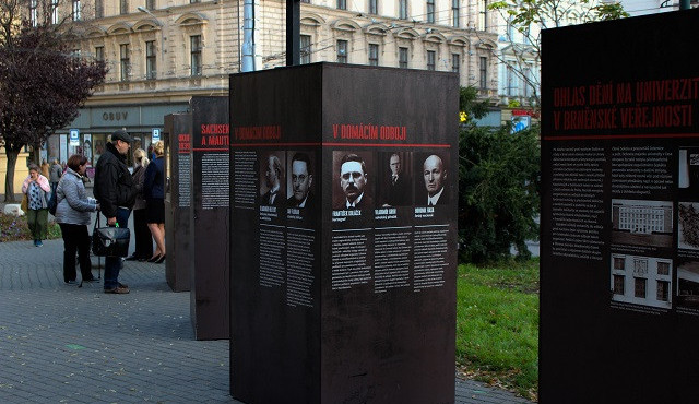 Na Žerotínově náměstí před rektorátem Masarykovy univerzity vyrostla panelová výstava, která je volně přístupná každému, kdo projde kolem. Jednotlivé panely upozorňují na nejtragičtější období dějin univerzity, na éru nacistické okupace a šestileté uzavření školy. Na osudech profesorů a studentů budou moci návštěvníci vidět různé druhy reakcí na dramatické události v dějinách národa i školy.