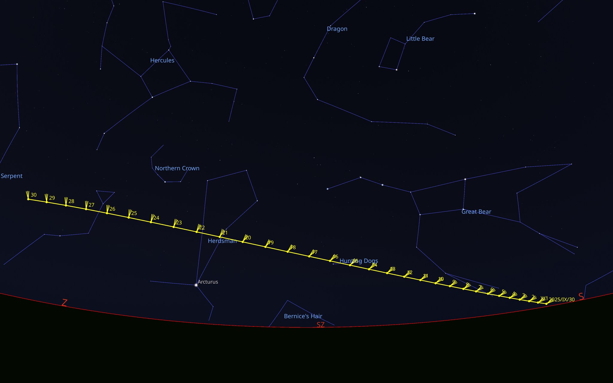 Zhruba od 15. října ji nalezneme nejprve v souhvězdí Honicích psů a později v Pastýři. Právě tam by měla dosáhnout největší jasnosti.